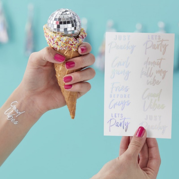 Dočasné nalepovacie tetovanie s nápisom LET’S PARTY.