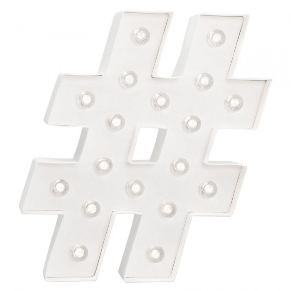 Originálna dekorácia či darček v podobe LED svietiaceho znaku # , ktorý dodáva slávnostný osobitý štýl na svadbách, večierkoch a oslavách, či ako svetielko v detskej izbe. Napájanie je na dve AAA batérie, ktoré nie sú súčasťou balenia.