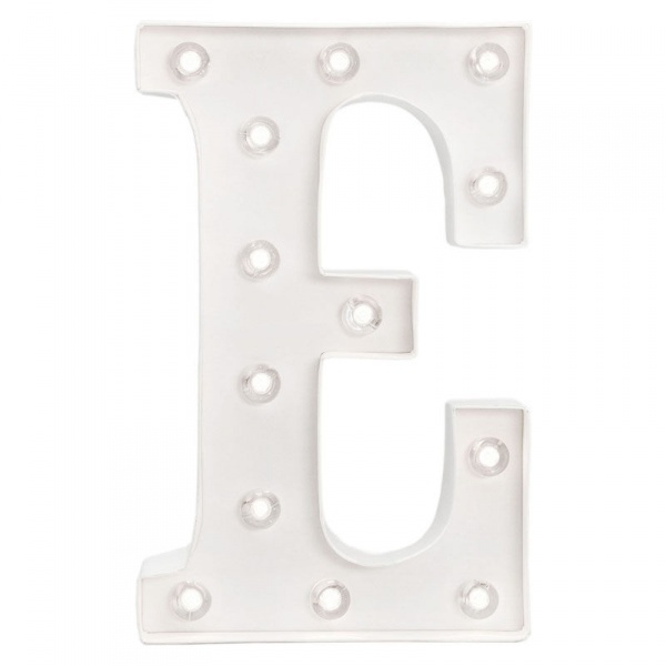 Originálna dekorácia či darček v podobe LED svietiaceho písmena E, ktorá dodáva slávnostný osobitný štýl na svadbách, večierkoch, oslavách alebo ako svetielko v detskej izbičke. Napájanie je na dve AAA batérie, ktoré nie sú súčasťou balenia. Výška 26 cm.