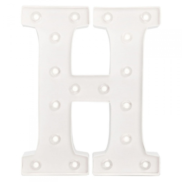 Svietiace písmeno H v bielej farbe, s LED žiarovkami so spínačom a chráničom žiaroviek (bez batérií - potrebné sú 2x AAA batérie).