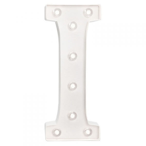 Svietiace písmeno I v bielej farbe, s LED žiarovkami so spínačom a chráničom žiaroviek (bez batérií - potrebné sú 2x AAA batérie).