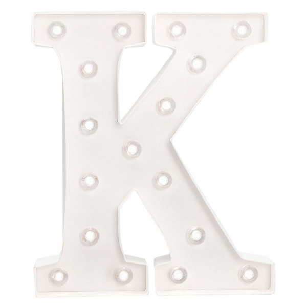 Svietiace písmeno K v bielej farbe, s LED žiarovkami so spínačom a chráničom žiaroviek (bez batérií - potrebné sú 2x AAA batérie).