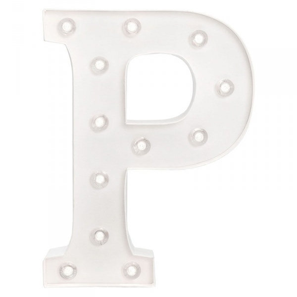 Svietiace písmeno P v bielej farbe, s LED žiarovkami so spínačom a chráničom žiaroviek (bez batérií - potrebné sú 2x AAA batérie).