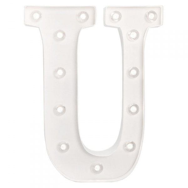 Svietiace písmeno U v bielej farbe, s LED žiarovkami so spínačom a chráničom žiaroviek (bez batérií - potrebné sú 2x AAA batérie).