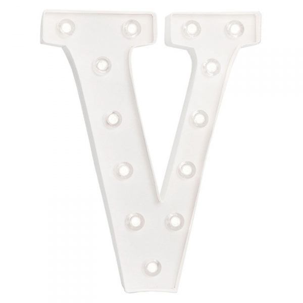 Svietiace písmeno V v bielej farbe, s LED žiarovkami so spínačom a chráničom žiaroviek (bez batérií - potrebné sú 2x AAA batérie).