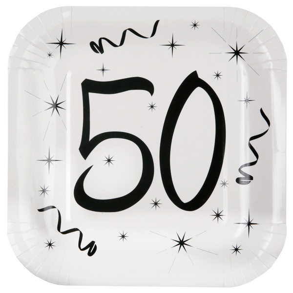 Sada 10 kusov štvorcových papierových tanierikov v bielo-čiernom prevedení s číslicou 50. Skvelá narodeninová oslava.